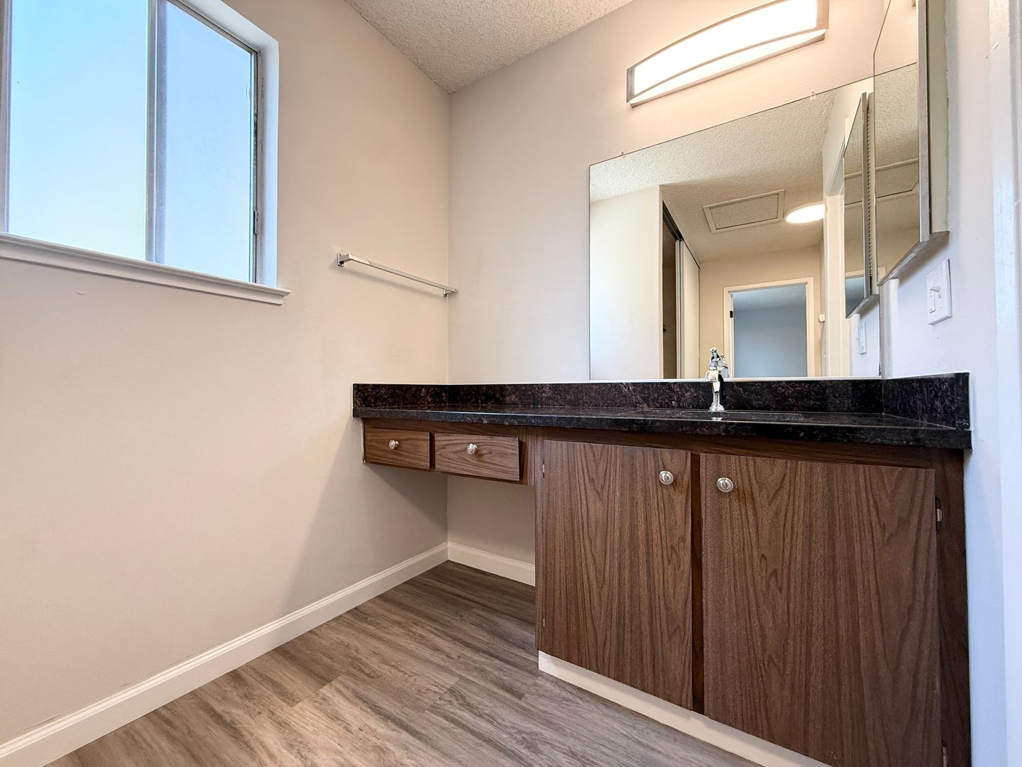 · Kitchen features beautiful granite countertops, modern white cabinetry and dishwasher!