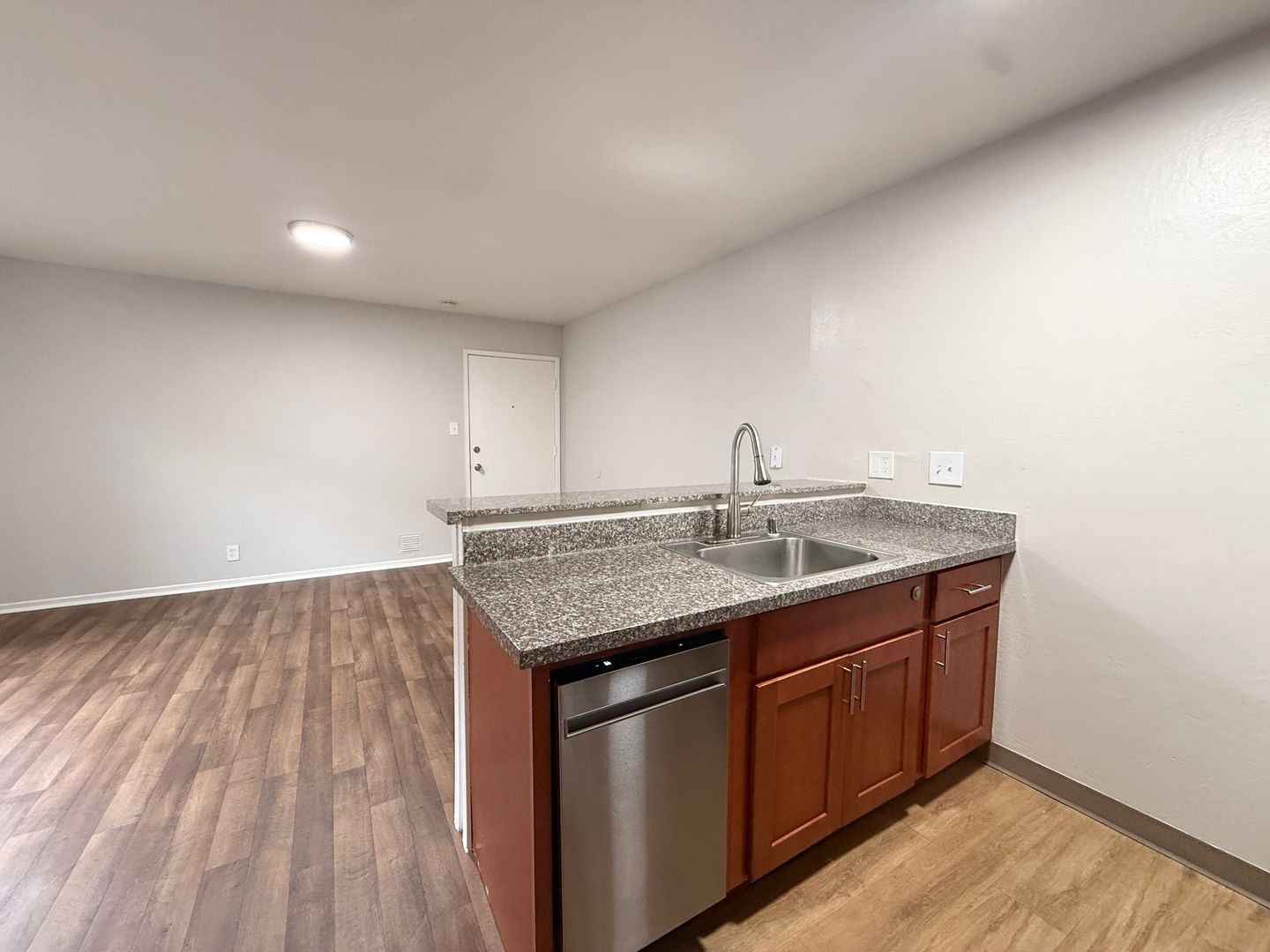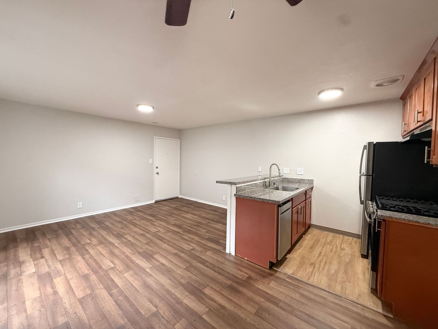 -New wood flooring in kitchen & bath, carpeted bedroom.