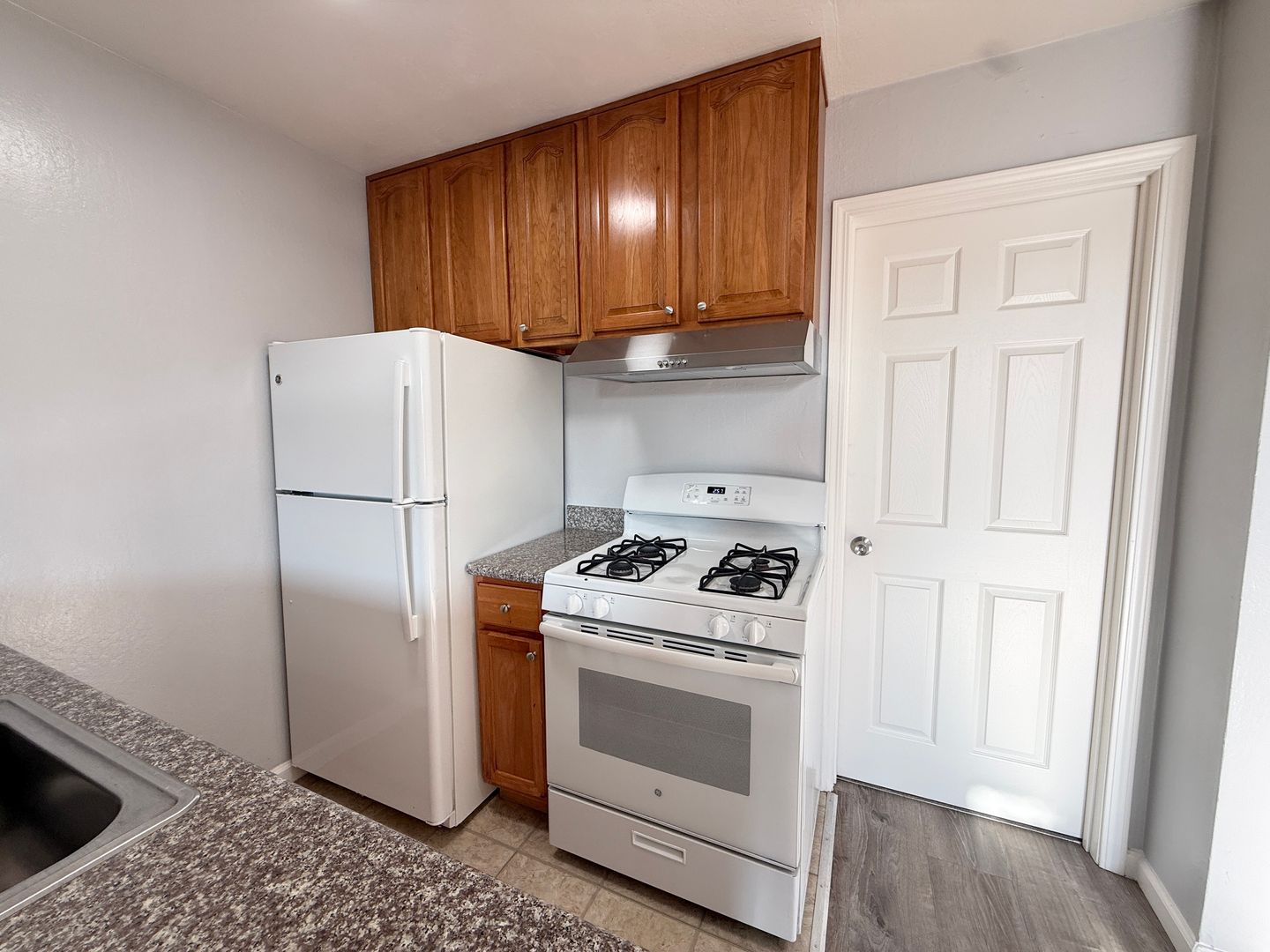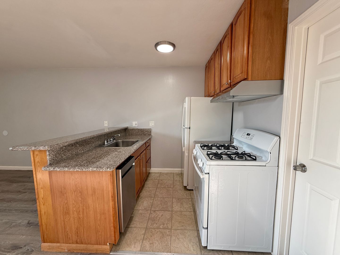 -New appliances: dishwasher, range hood, range, and refrigerator.