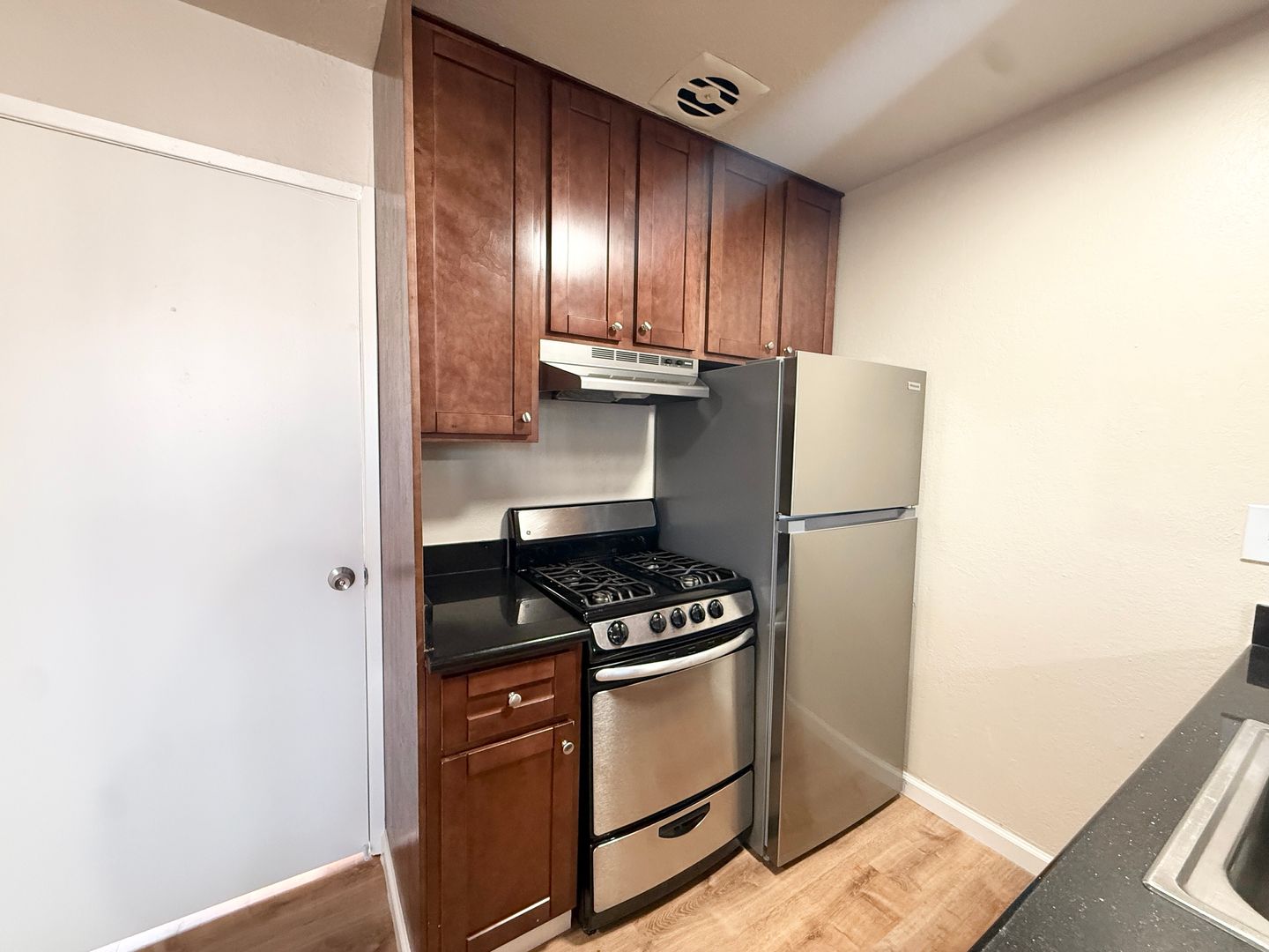 -New stainless steel appliances: dishwasher, rangehood, and refrigerator.