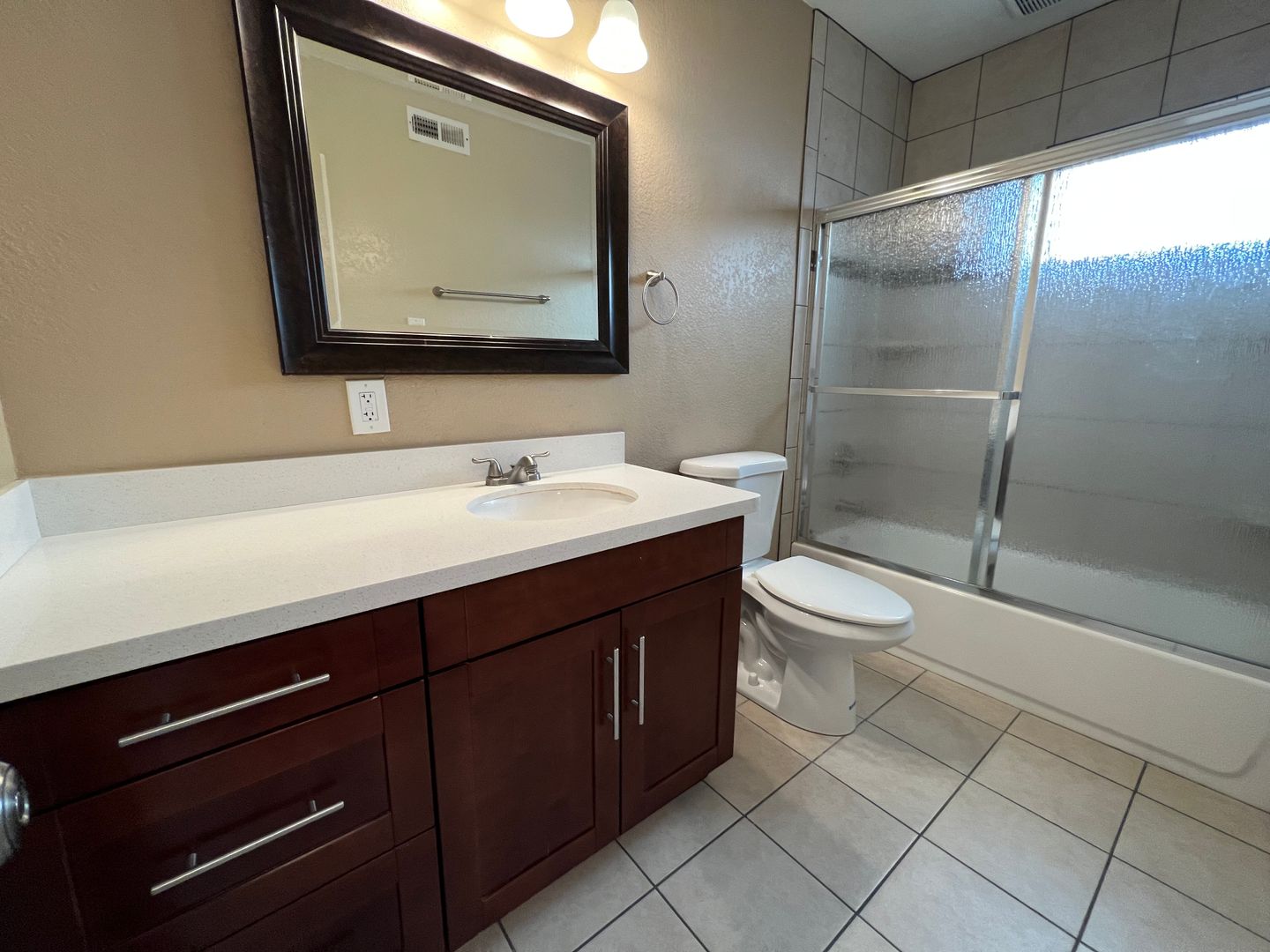 - Remodeled bathroom with large countertop and vanity storage.