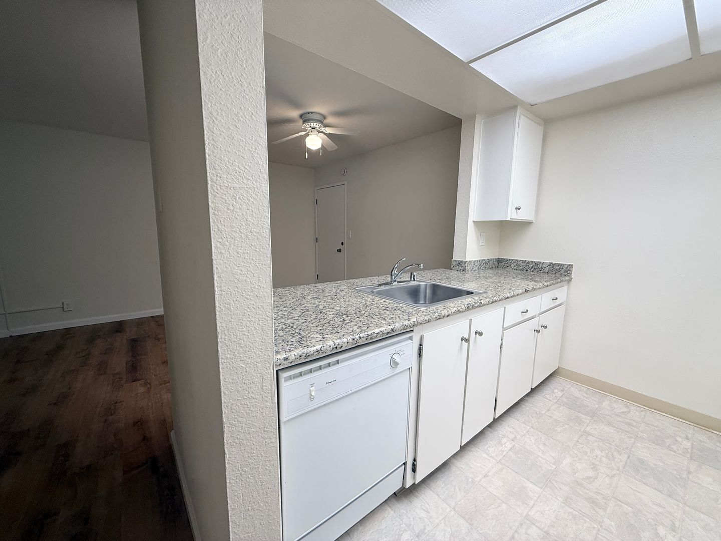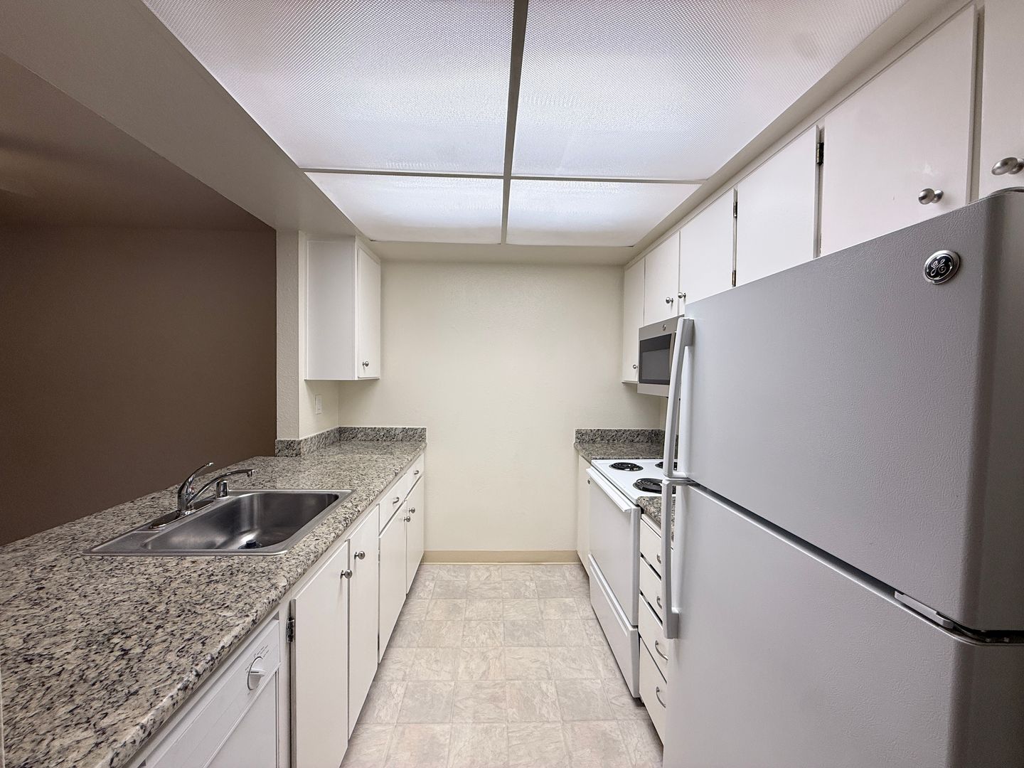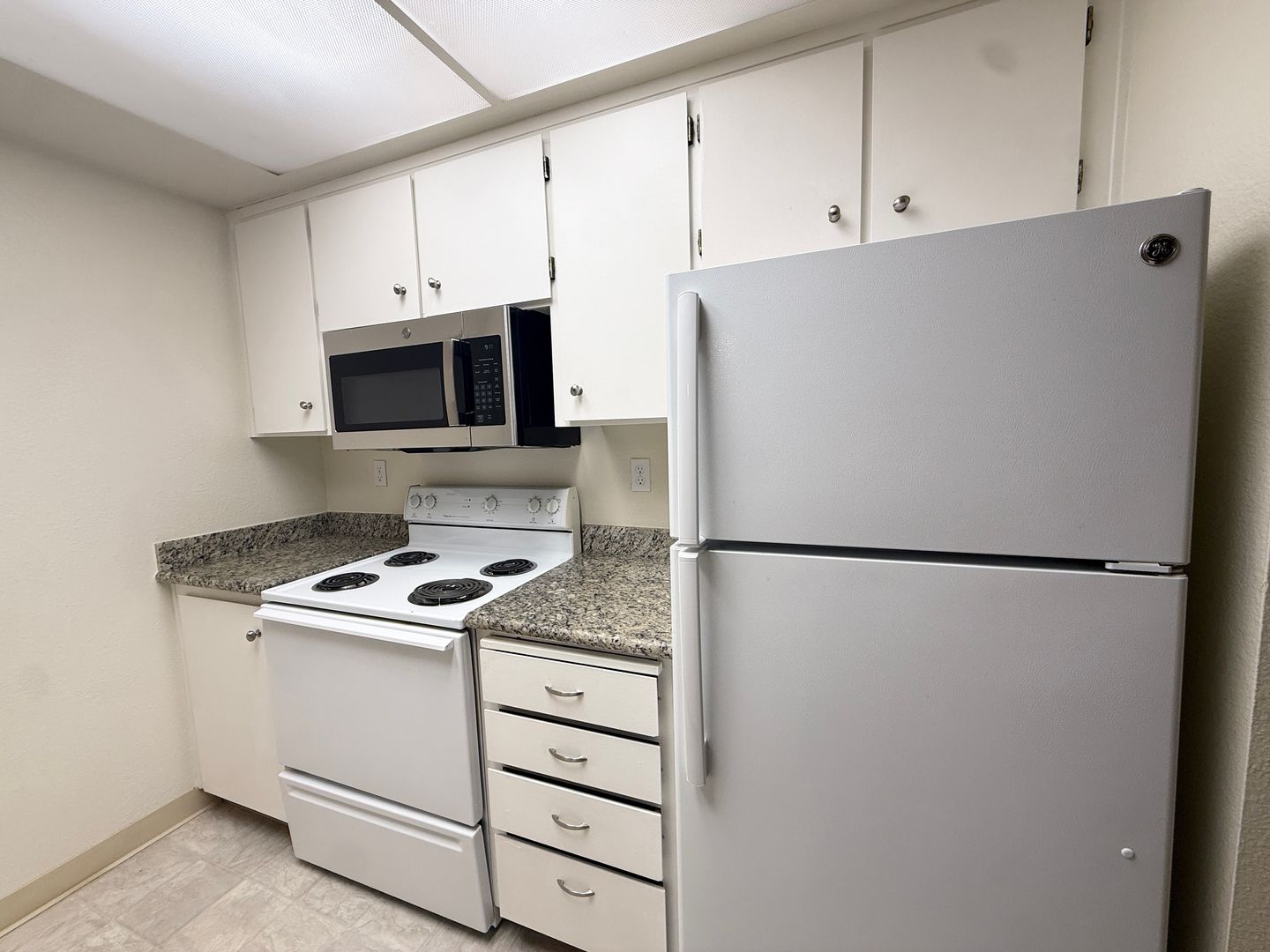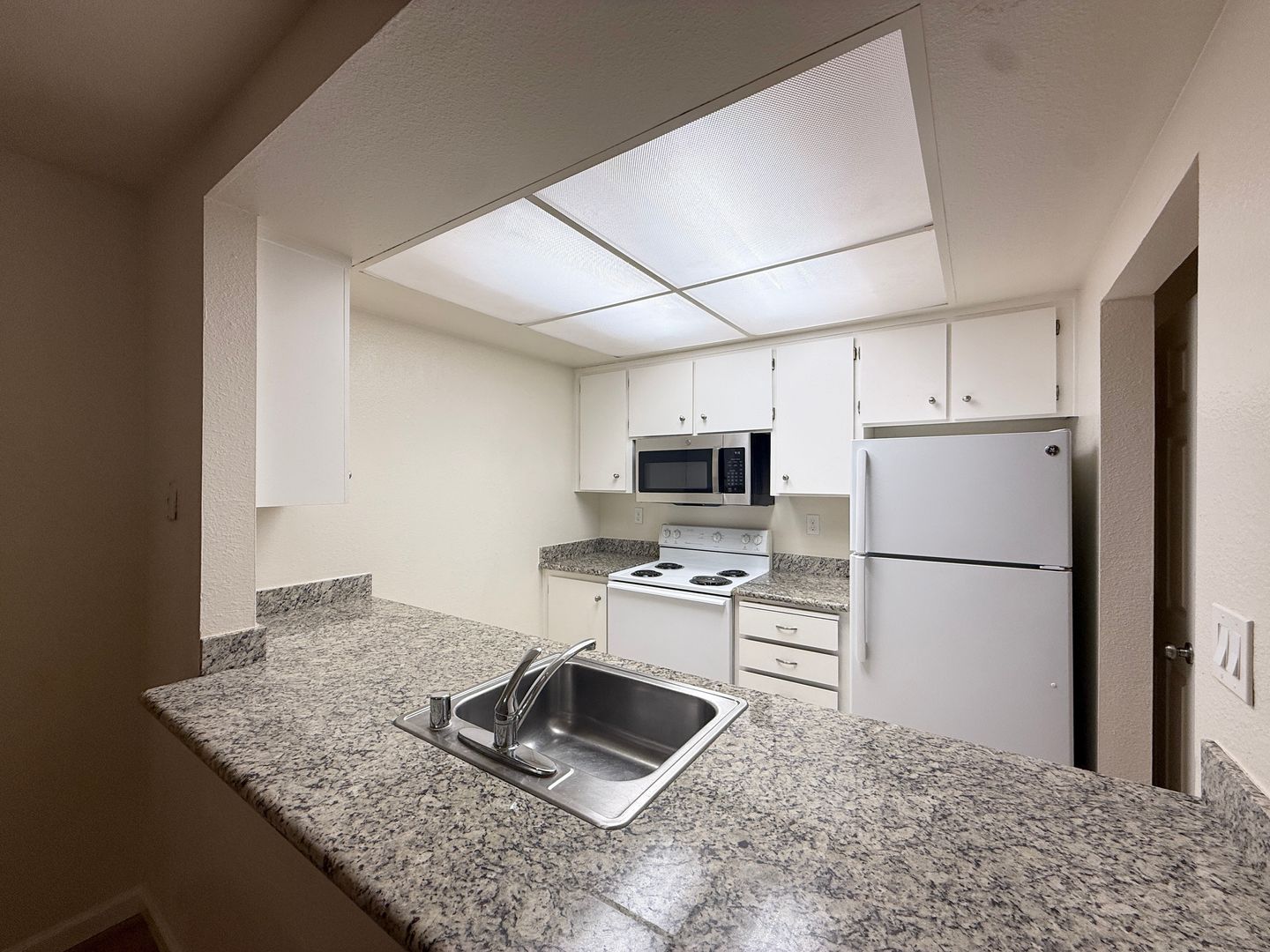 · Beautiful granite countertops with white cabinetry.