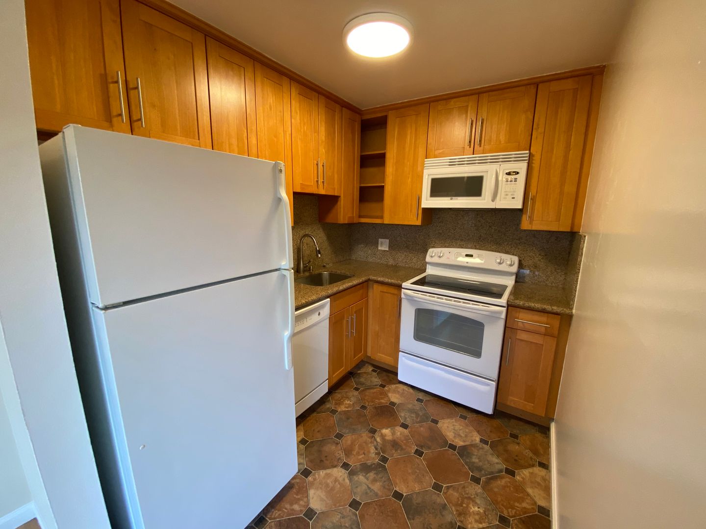 - Updated kitchen cabinets with granite counters and backsplash.